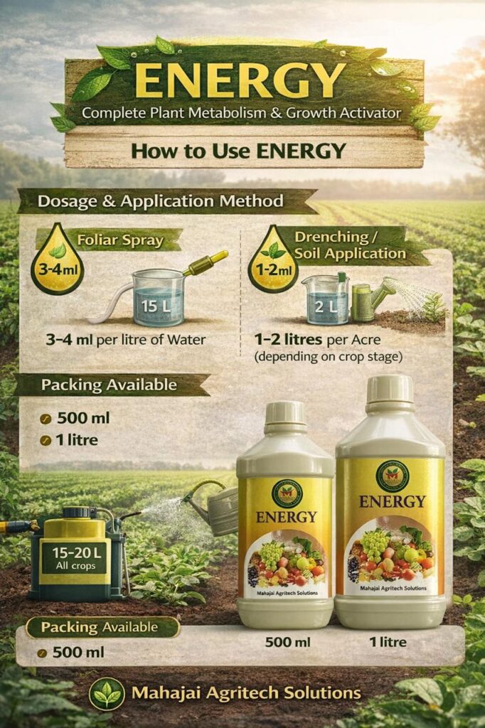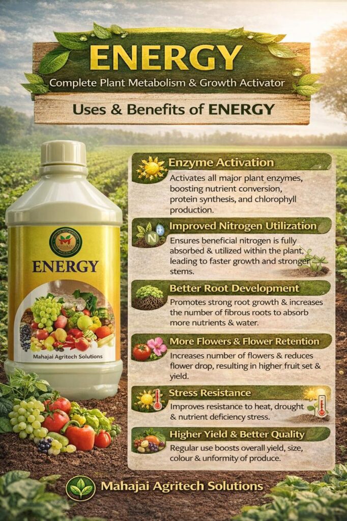 Energy is a unique bio-stimulant designed to enhance plant metabolism, activate essential enzymes, and improve overall growth at every stage of the crop cycle. It helps the plant absorb and utilize nitrogen efficiently, resulting in stronger, healthier and high-yielding crops.